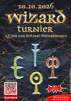 Am 22.11.2025 findet unser erstes WIZARD Turnier statt! Das Turnier startet um 15:00 im Gasslhof/Festsaal der Gemeinde Steinakirchen am Forst.